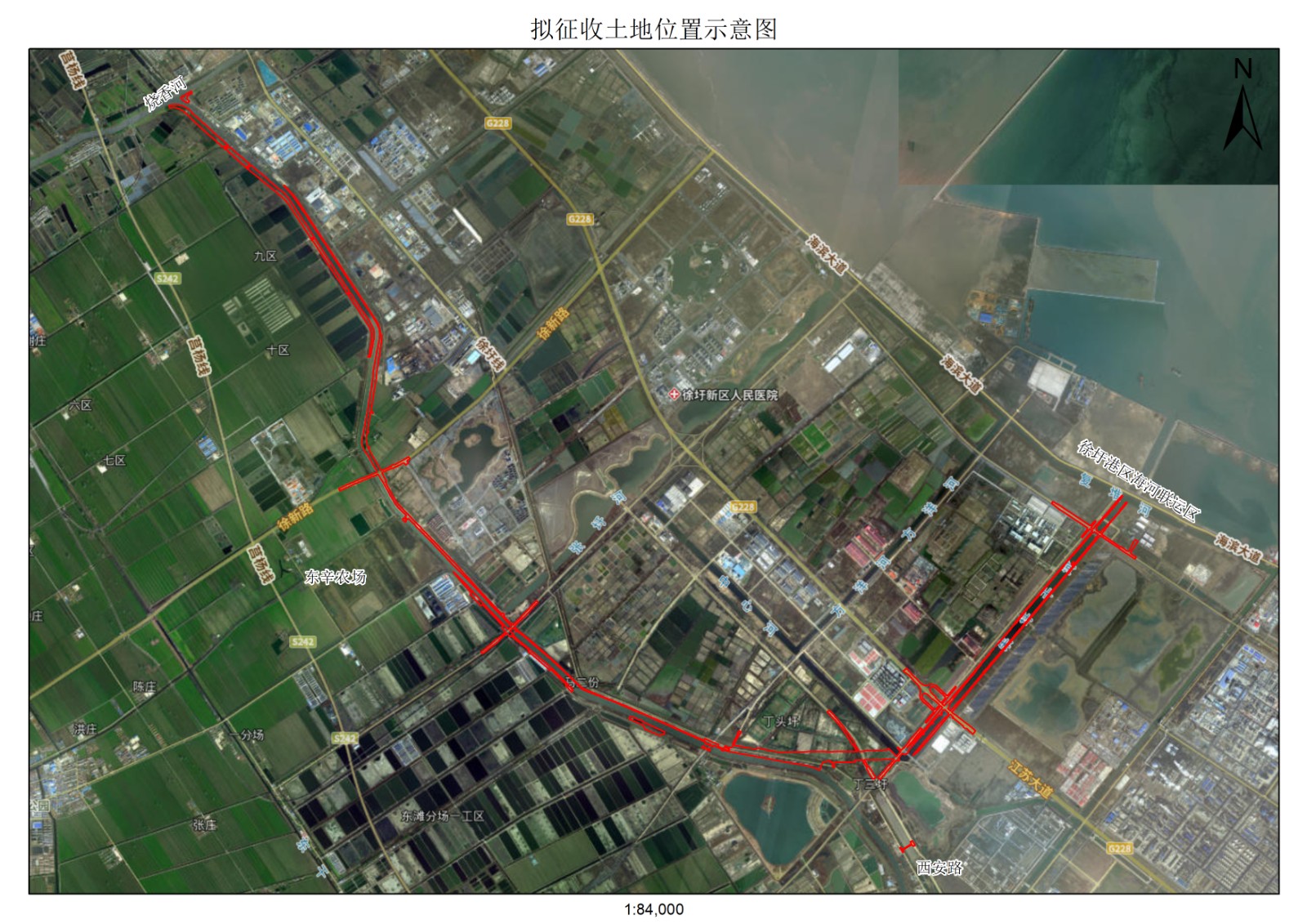 本次拟征收土地四至为东至徐圩港区海河联运区,南至西安路,西至东辛农场,北至烧香河。拟征收土地位置详见附图。