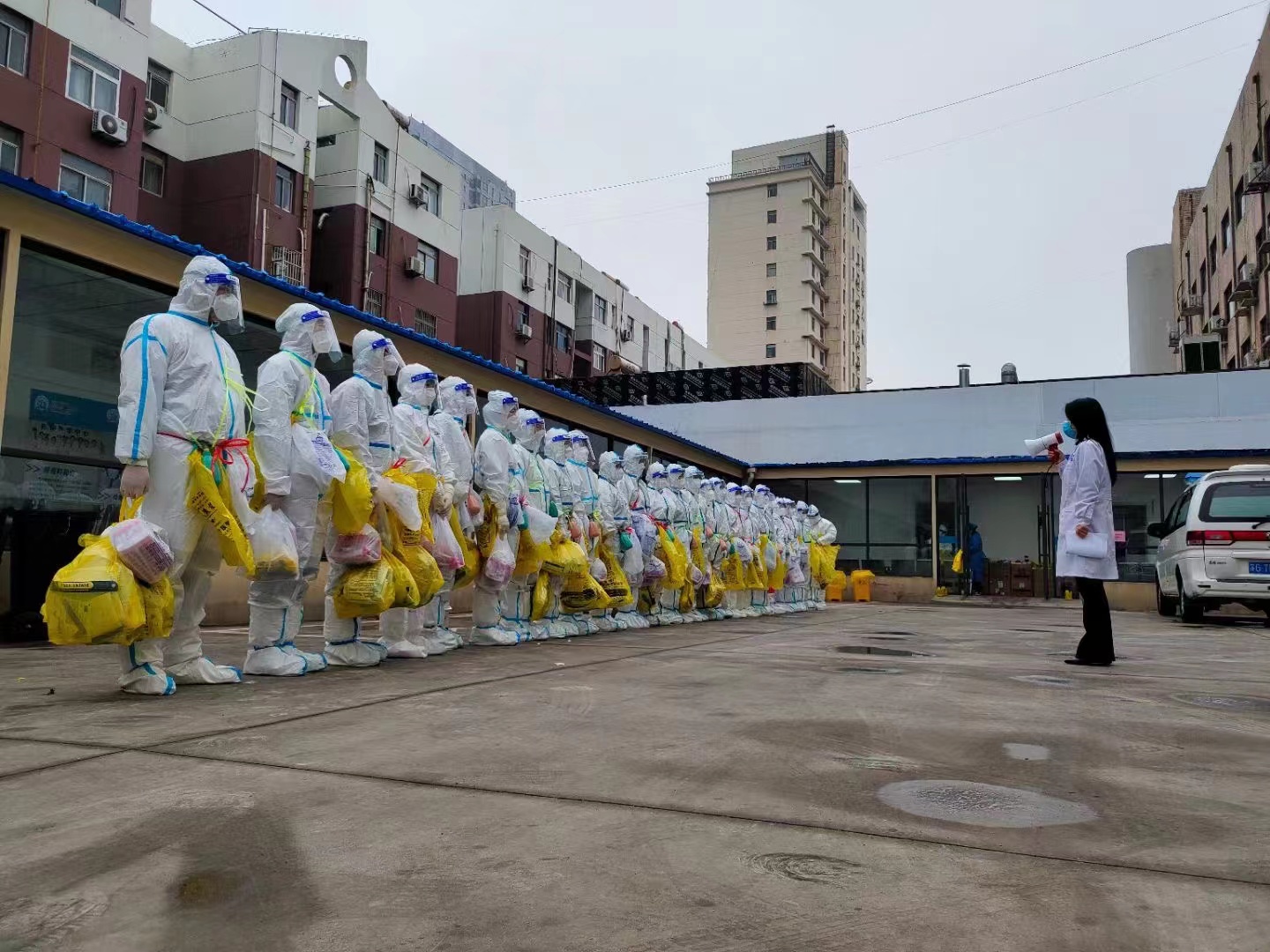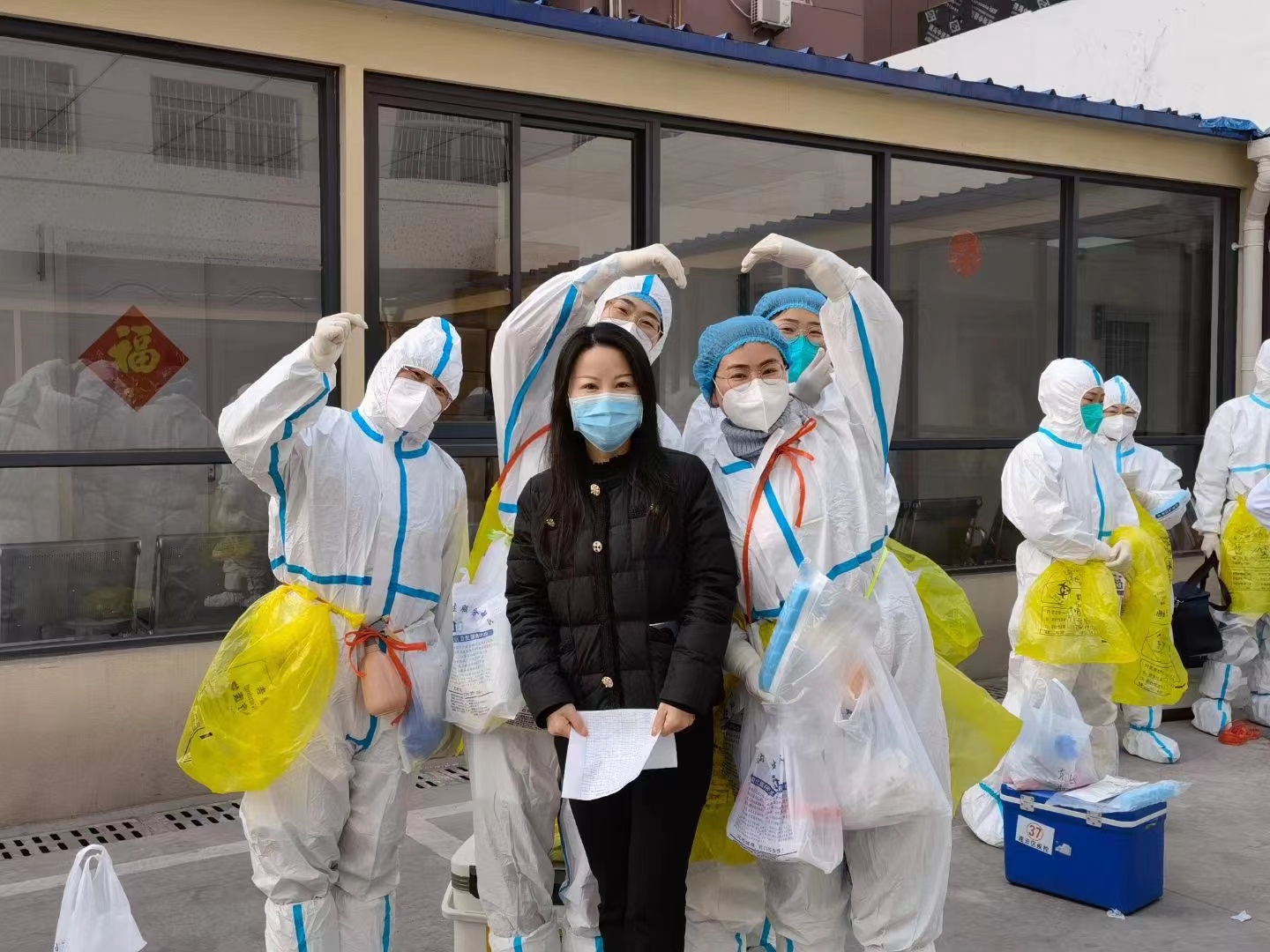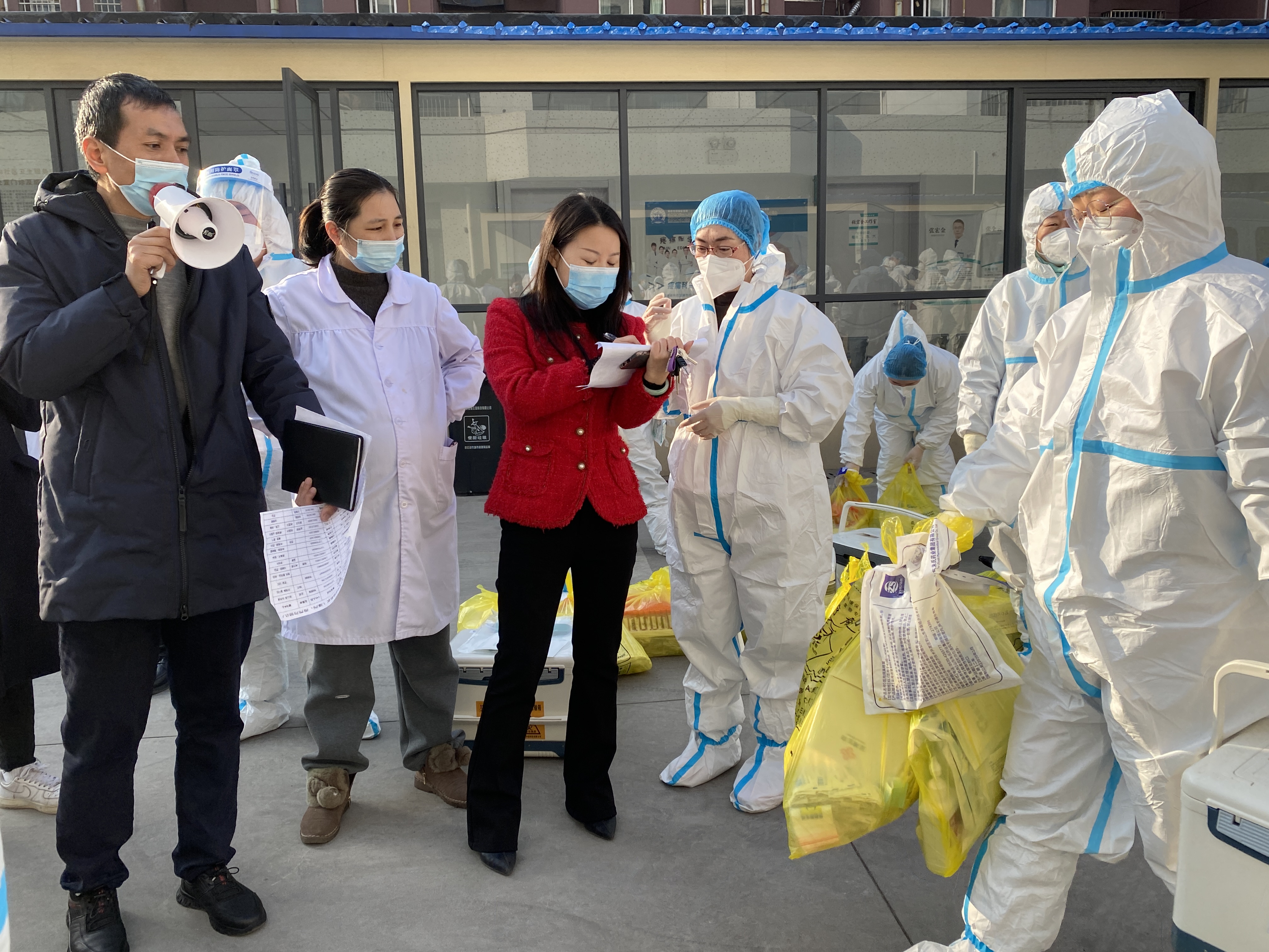 “封控区东城海岸急需防护服一套!请后勤保障组抓紧送到位!”中心疫情防控工作群里传来入户采样人员的呼救。此时,中心后勤保障组人员全部都奔赴在运送物资的路上,正在临时指挥中心统筹部署的吴海霞拖着疲惫的身躯迅速起身,“闻医生,准备好防护服和其它备用物资,我去东城海岸!不能让采样人员和居民等着急了!”一边说着,一边拎起了物资,消失在薄雾中......